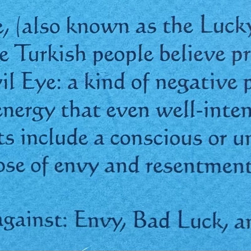The Evil Eye (aka the Lucky Eye Bead) is an amulet the Turkish people believe protects against the Evil Eye: a kind of negative power or bad energy that even well intentioned compliments include a conscious or unconscious dose of envy and resentment.