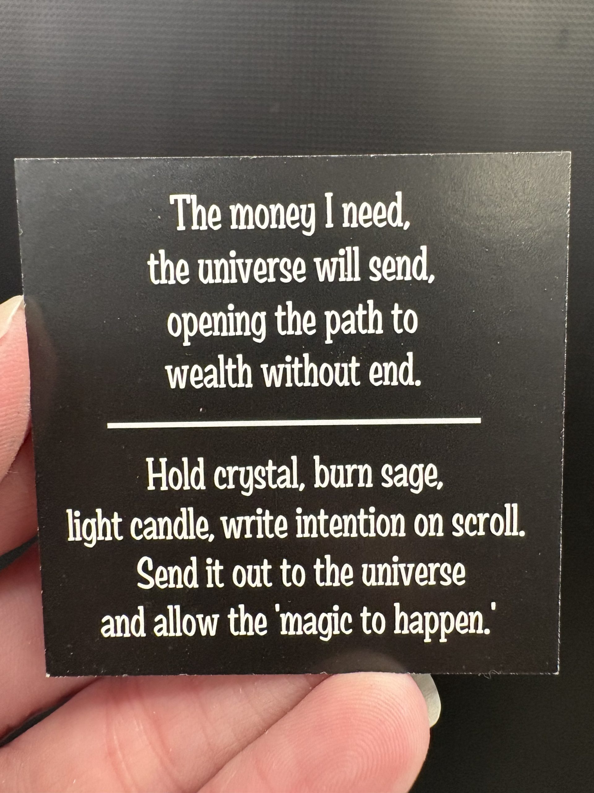 ‘the money i need, the universe will send, opening the path to wealth without end.’ recite this or another affirmation to open to money/wealth into your life in all ways!