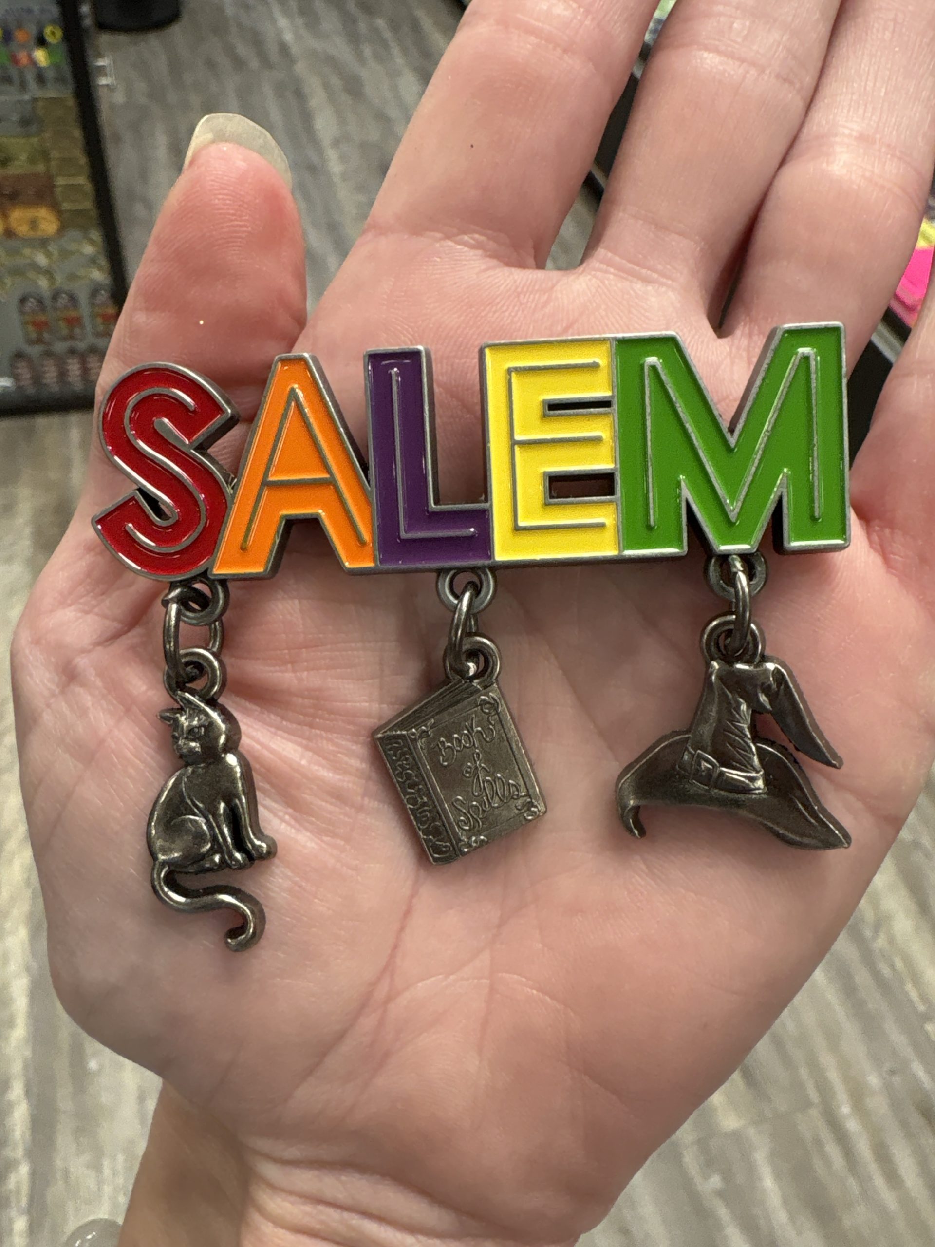 Cat, book and witch hat hang from SALEM
