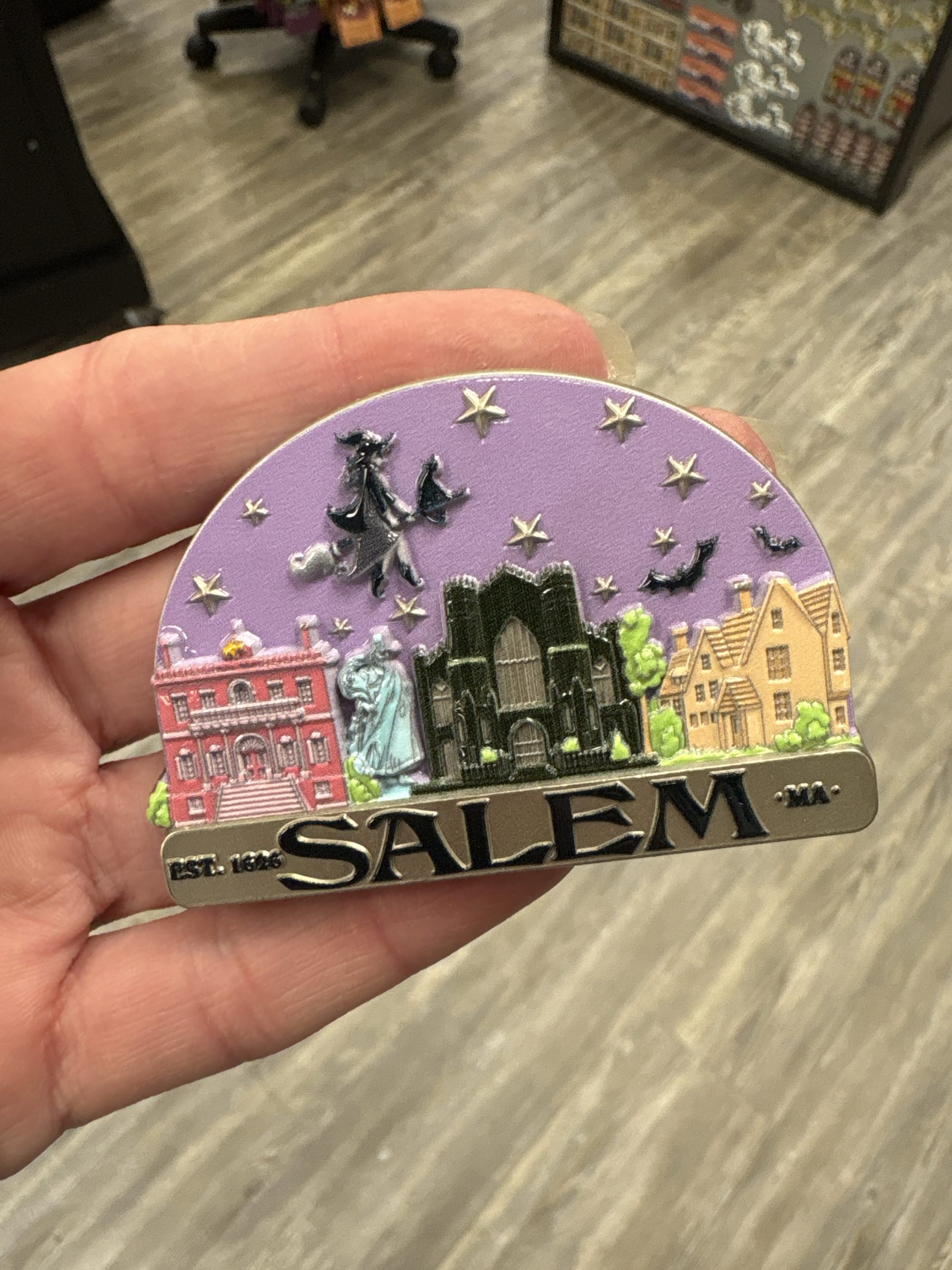 Salem Witch Flying Over City Metal Magnet Multi Color
