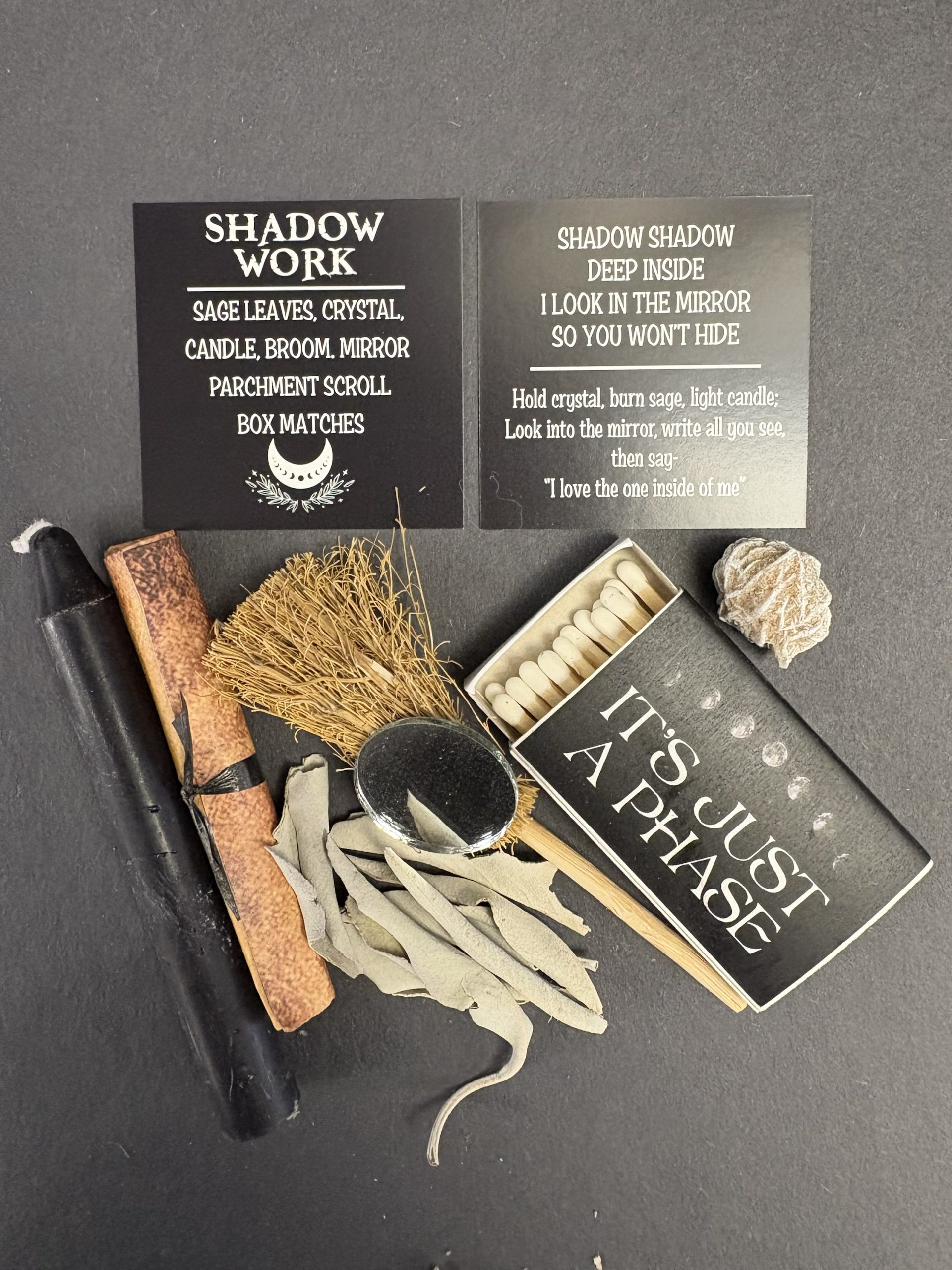 Sage leaves, crystal, candle, broom, mirror, parchment scroll, box of matches.